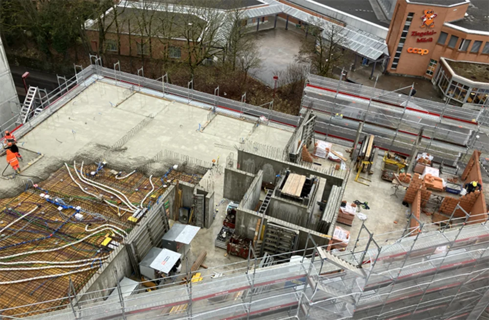 Wo vor zwei Monaten noch im Keller und Erdgeschoss gebaut wurde, wächst das Gebäude nun fleissig in die Höhe. Aktuell werden die Wände und die Decke des 3. Stocks gebaut. Die Bauarbeiten finden jeweils in zwei Etappen statt – Etappe 1 im vorderen Teil des Gebäudes und im Anschluss Etappe 2 im hinteren Gebäudeteil. Die Arbeiten schreiten voran und wir freuen uns über jeden sichtbaren Fortschritt.